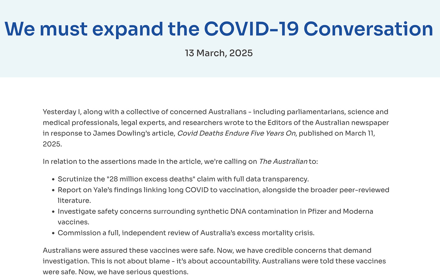Yesterday I, along with a collective of concerned Australians - including parliamentarians, science and medical professionals, legal experts, and researchers wrote to the Editors of the Australian newspaper in response to James Dowling’s article, Covid Deaths Endure Five Years On, published on March 11, 2025.