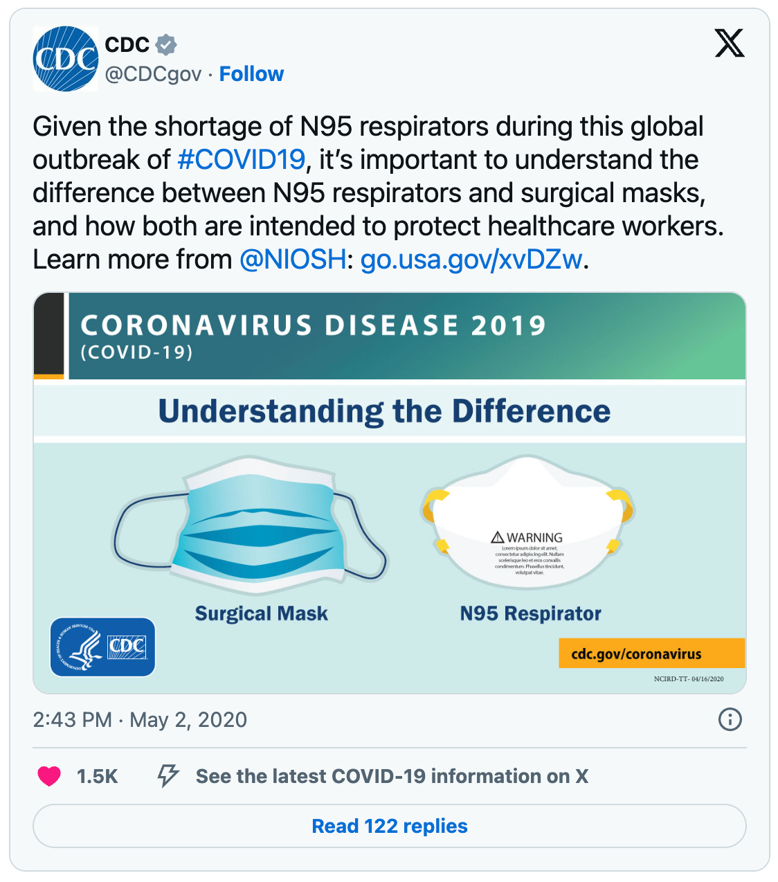 That same month, the CDC began publicly promoting N95 respirators as a more effective means of controlling the spread of COVID-19.