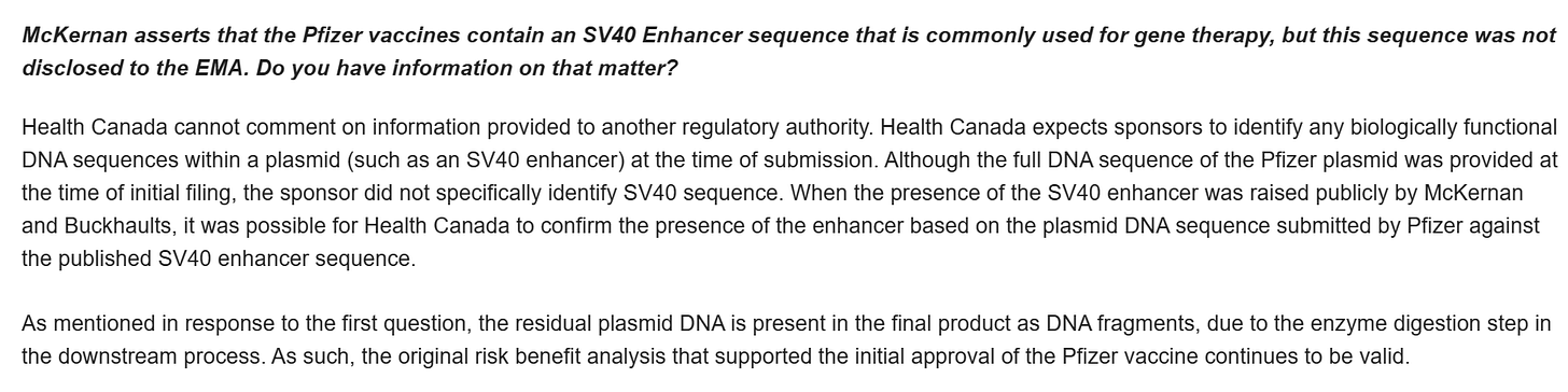 The Epoch Times immediately contacted Health Canada about this, and they confirmed that, "Although the full DNA sequence of the Pfizer plasmid was provided at the time of initial filing, the sponsor did not specifically identify the SV40 sequence."