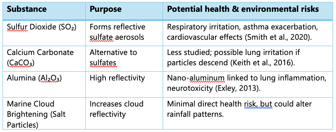 Exposure to SO₂ is linked to asthma, bronchitis, and heart disease (WHO, 2021). If SRM aerosols descend, urban air quality could worsen, particularly in polluted areas.