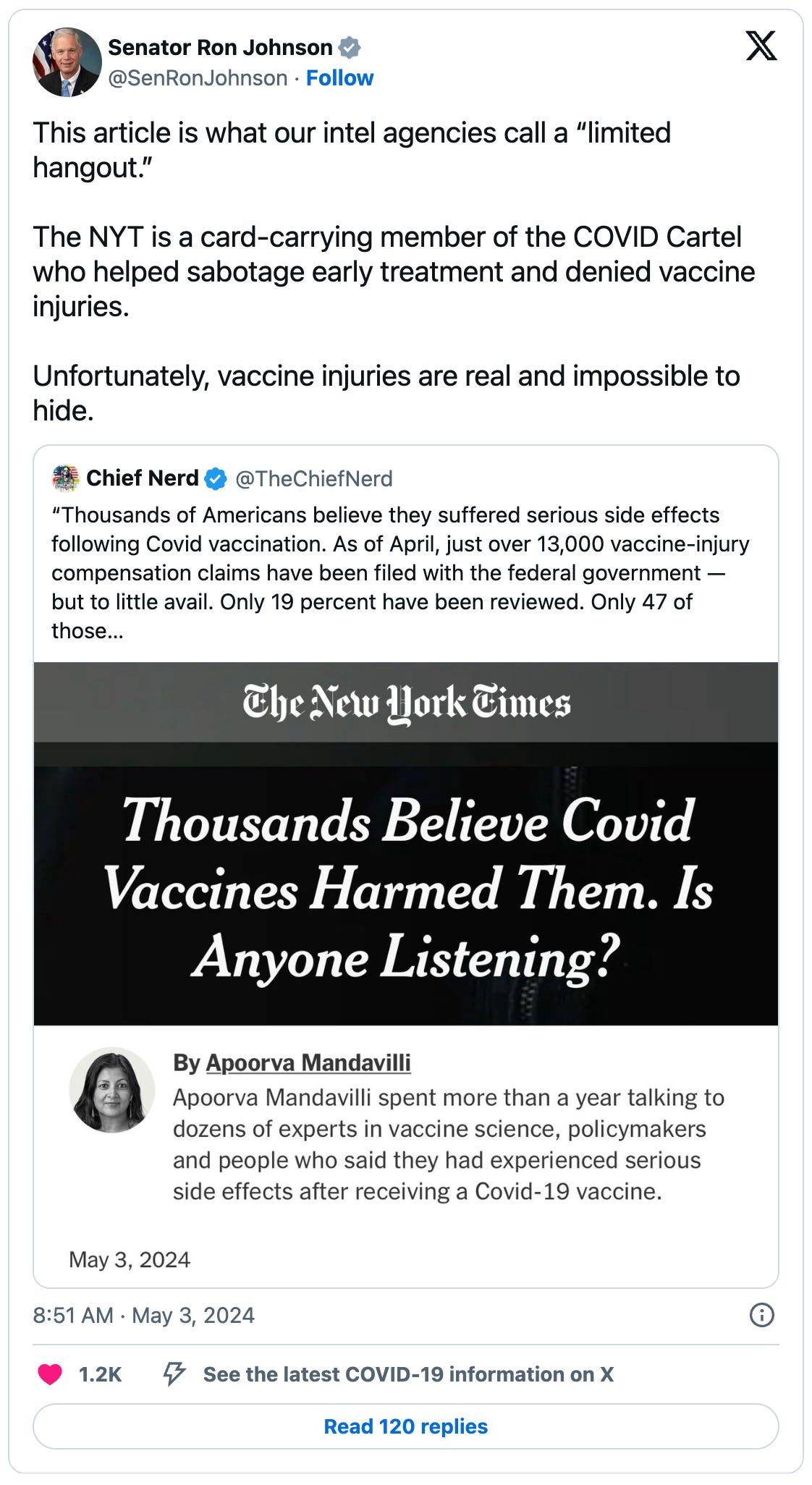 Sen. Ron Johnson (R-Wis.) tweeted that the article is a “limited hangout.” And that vaccine injuries “are real and impossible to hide.”