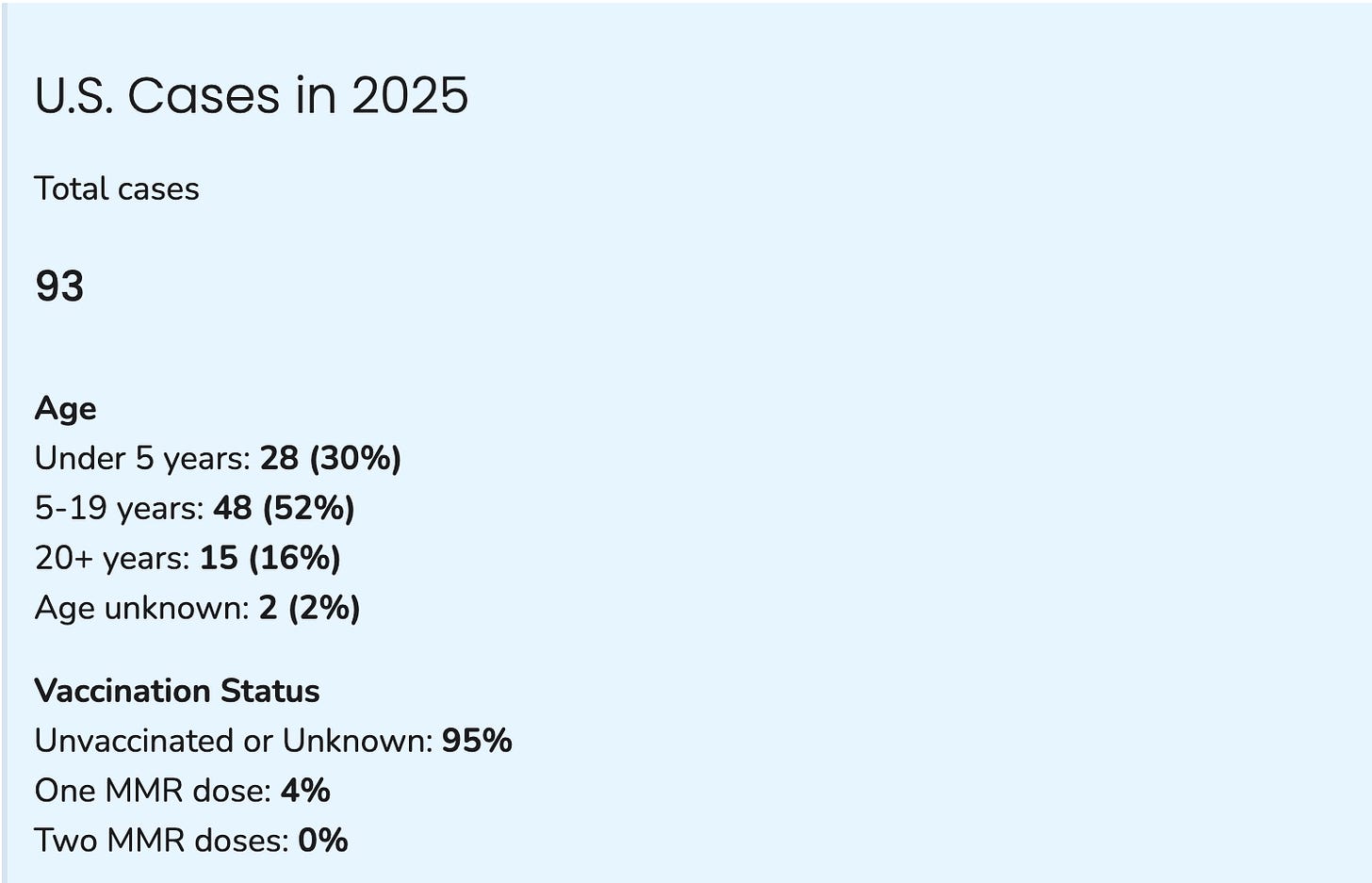 As of February 20, the CDC website stated 93 measles cases had been reported across eight jurisdictions, including Alaska, California, Georgia, and Texas. Here are the stats: