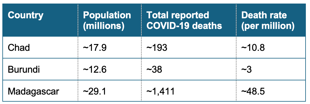 So, around 3 deaths per million in Burundi, 48.5 in Madagascar, 10.7 in Chad. Compare this to the global average of around 1,000 deaths per million, or the USA which had 3,300 deaths per million, and the contrast is stark.