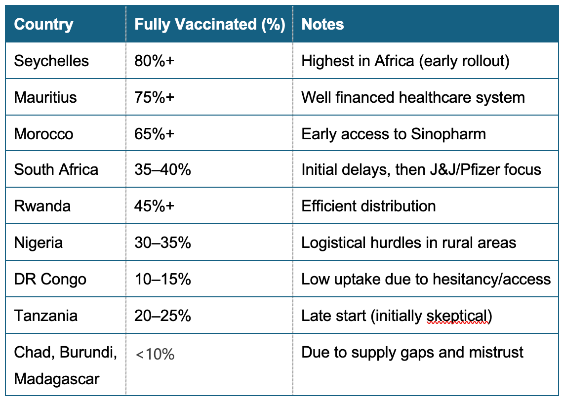 Africa had the lowest vaccination rates but also the lowest COVID-19 deaths (Okoro et al., 2025; Nordling, 2020). Here’s a snapshot: