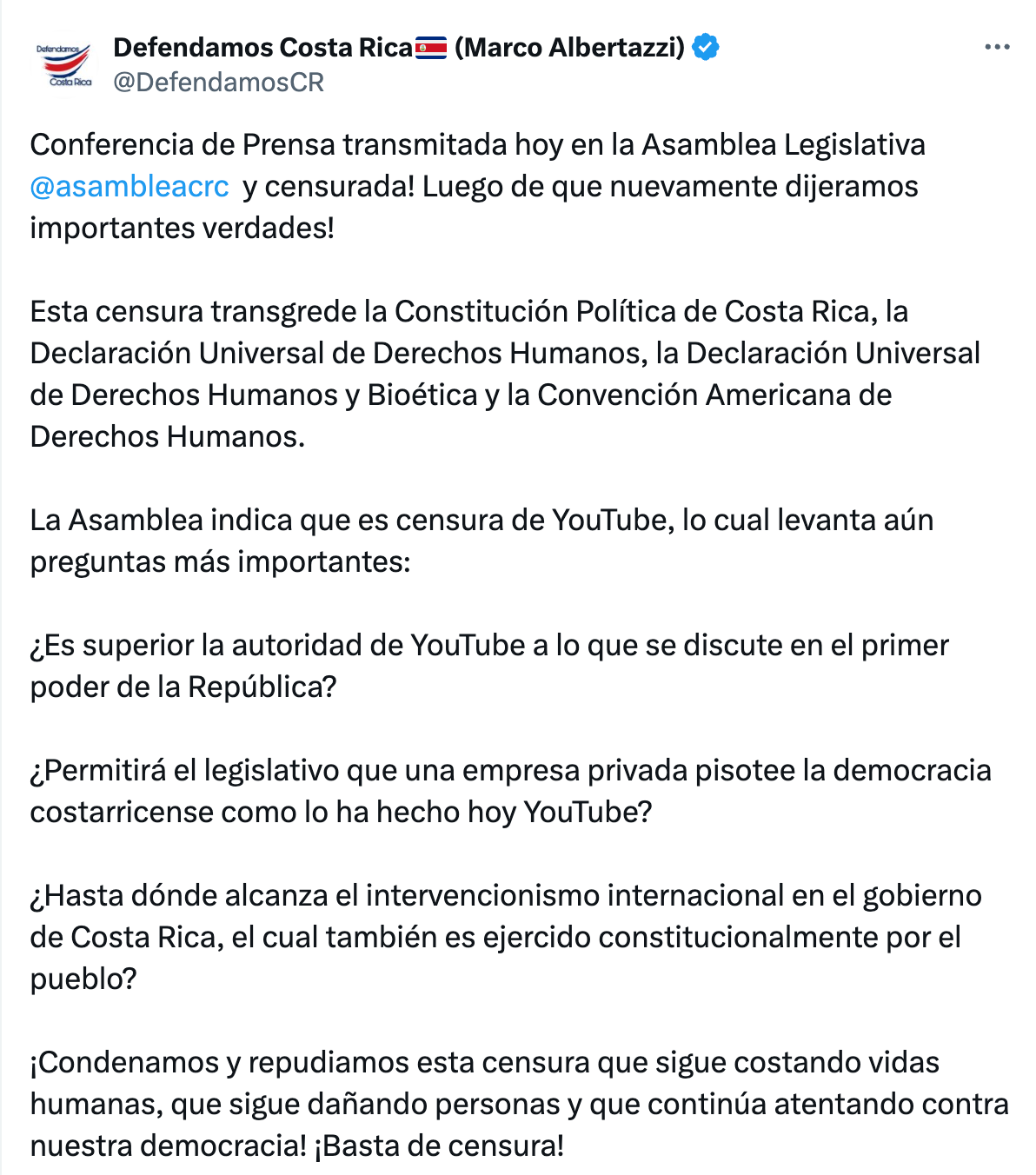 According to an organizer, Marco Albertazzi with Defendamos Costa Rica, video of the Press Conference was removed from YouTube at the behest of the Legislative Assembly in violation of the Political Constitution of Costa Rica, the Universal Declaration of Human Rights, the Universal Declaration of Human Rights and Bioethics and the American Convention on Human Rights.