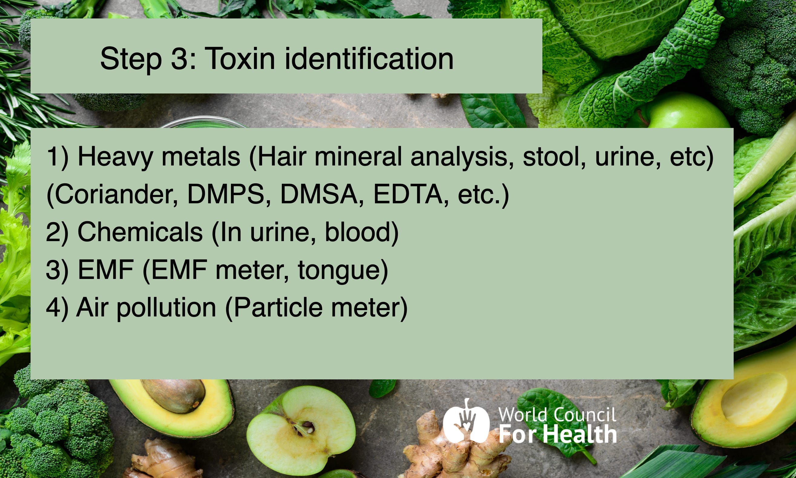 Identify the toxins you are exposed to: Different toxins require different tests. For example, did you know that you can check for EMF exposure by looking at your tongue in a mirror: if you can't hold it still, you may be exposed to high EMF levels. EMFs irritate the cranial nerve, which keeps contracting your tongue.