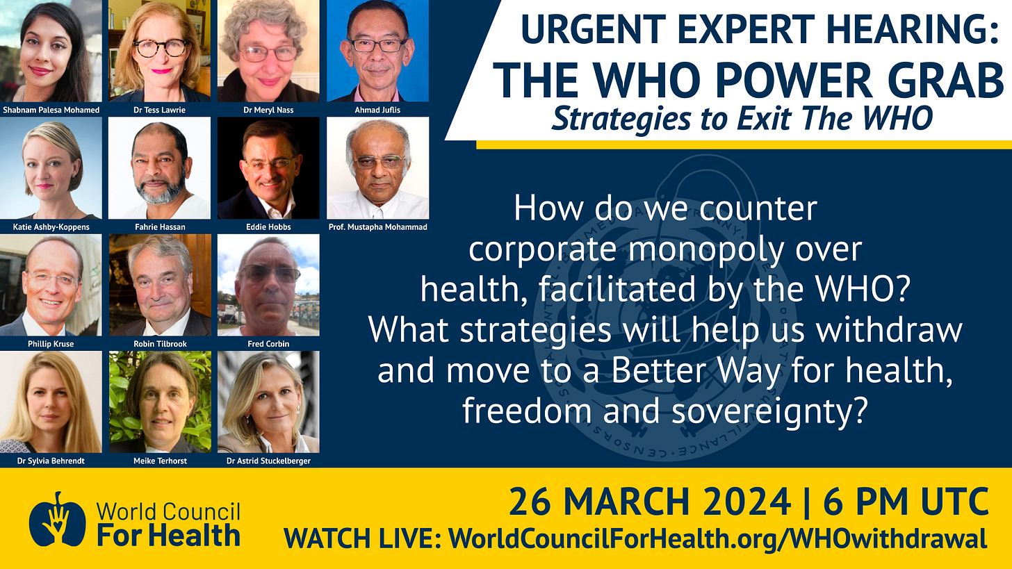 Join the Expert Hearing on Monday 26 March at 6 pm UTC on the World Council for Health website: https://worldcouncilforhealth.org/whowithdrawal