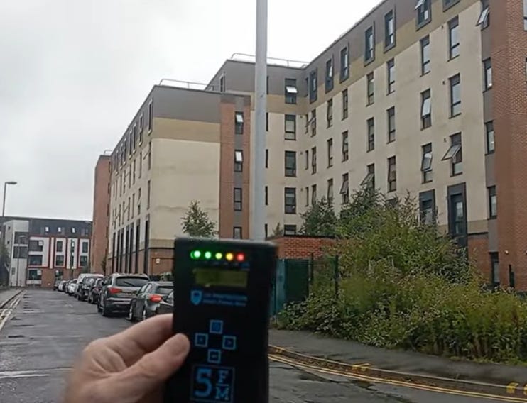 At the school fence, Glynn recorded a radio frequency reading of 1,554,932 µW/m, the highest he’s seen in the UK, emanating from a nearby 4G LTE tower. These dangerously high readings were observed just meters away from children's toys in the schoolyard. Liverpool has the largest 5G mesh network in the UK, the second biggest in the world.